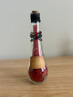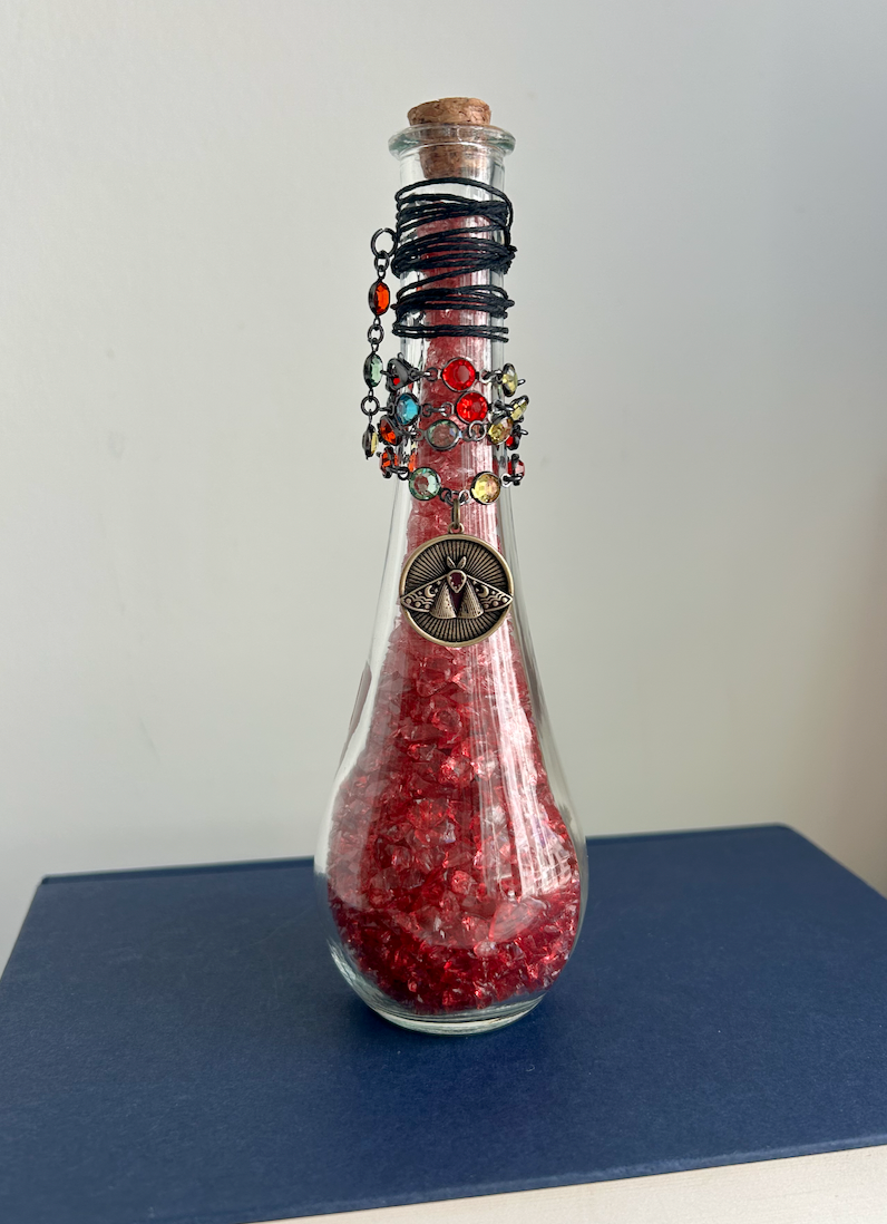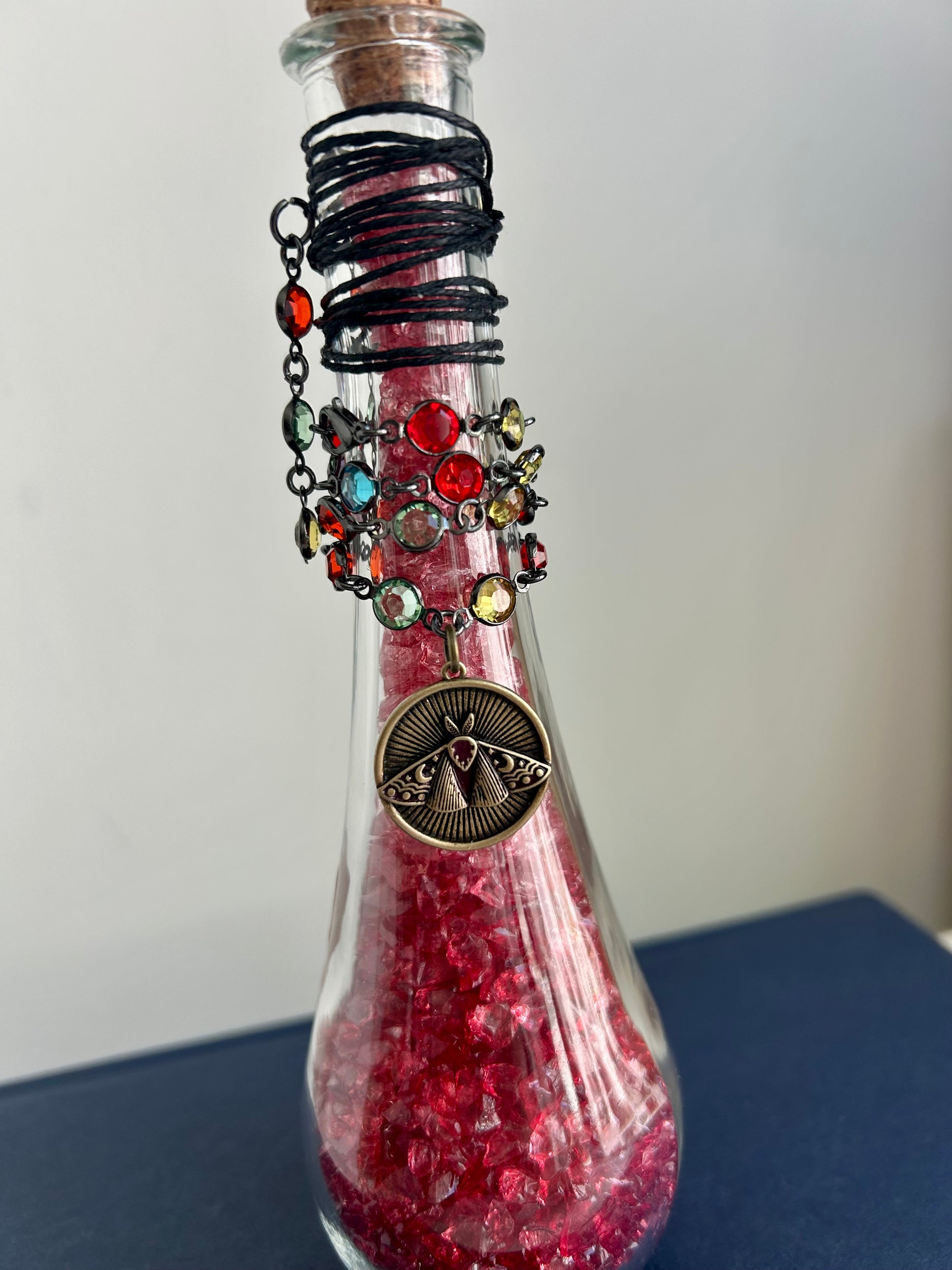 Glowing with the brilliance of ruby flame, The Crimson Moth is a potion of defiance and transformation. Encased in a tall glass vessel, its fiery red crystal glass shimmers like wings unfolding at dusk. Jeweled chains and a sunburst charm wrap the neck of the bottle, catching the light with every shift — a reminder of beauty found in both shadow and flame.