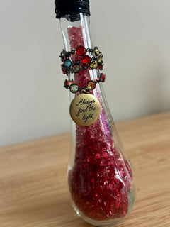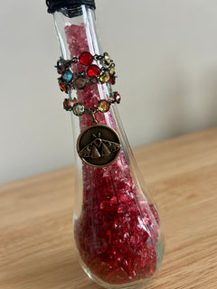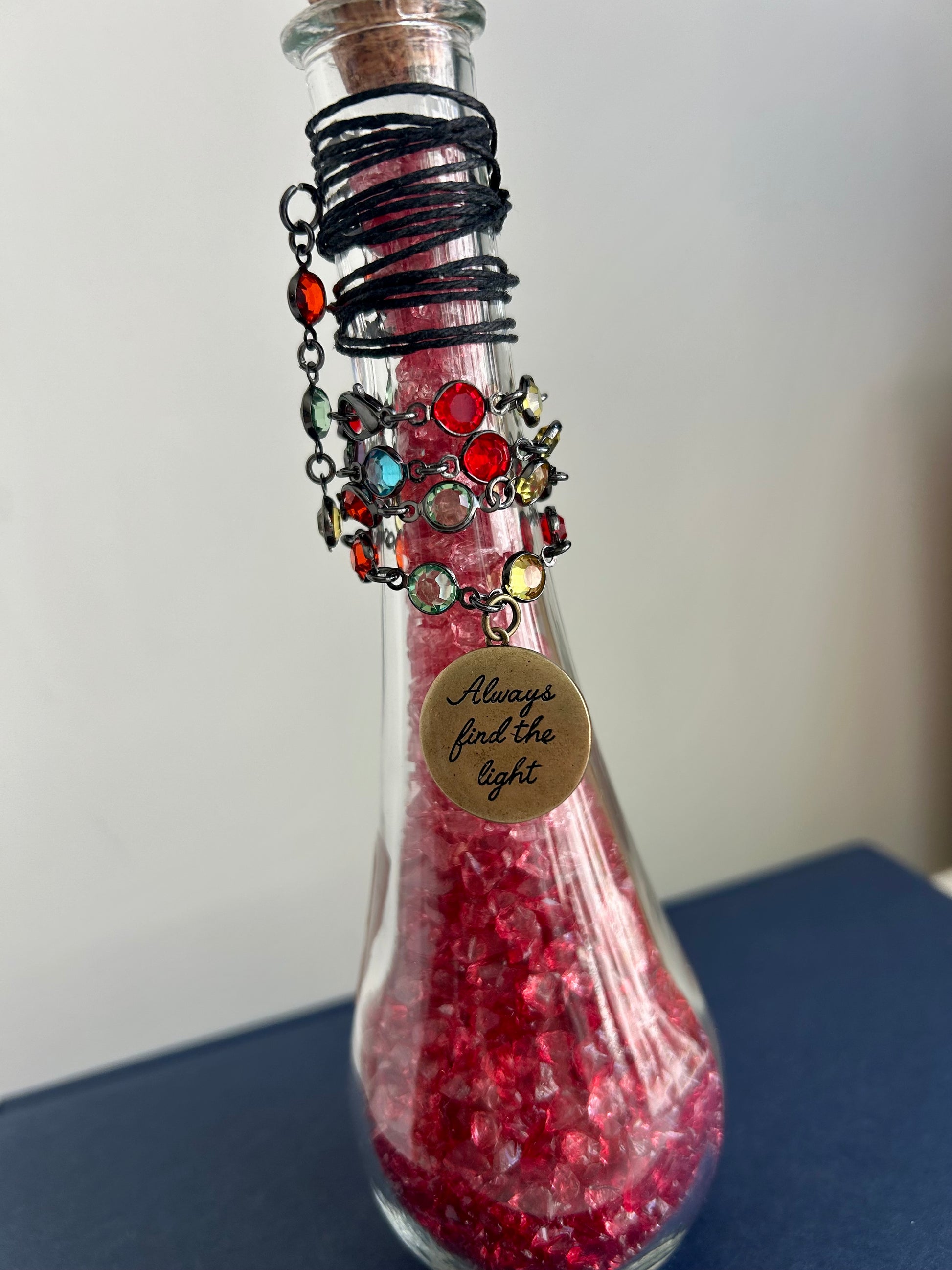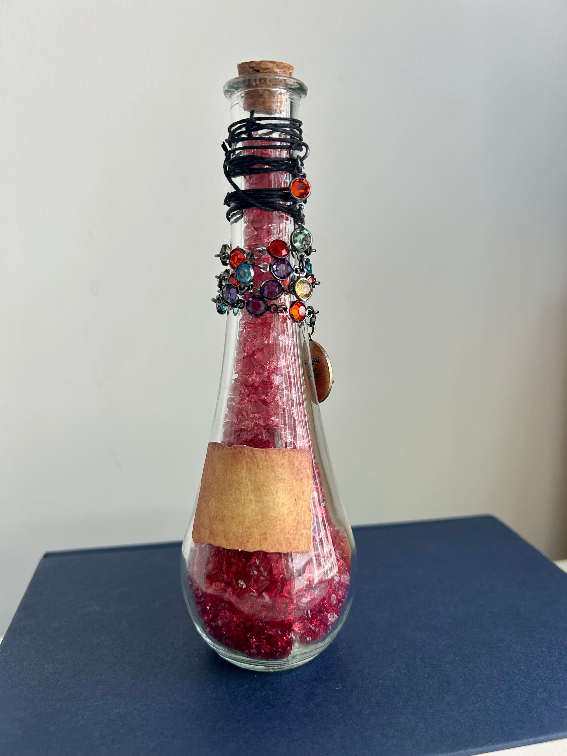 • Sealed with natural cork, wrapped in black cord with jewel chain and sunburst charm