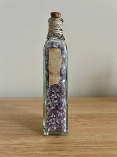 Wrapped in natural twine and sealed with a cork, the bottle is adorned with a polished silver crescent moon charm, symbolizing intuition, transformation, and the phases of growth we move through. It carries the peaceful energy of nightfall, when the world softens and magic feels closest.