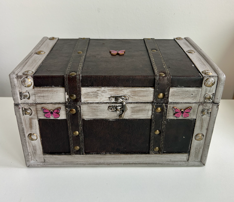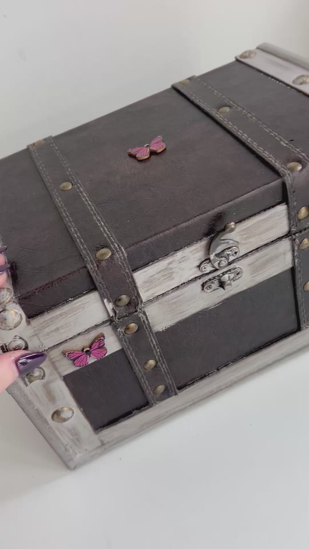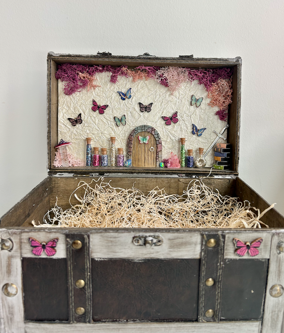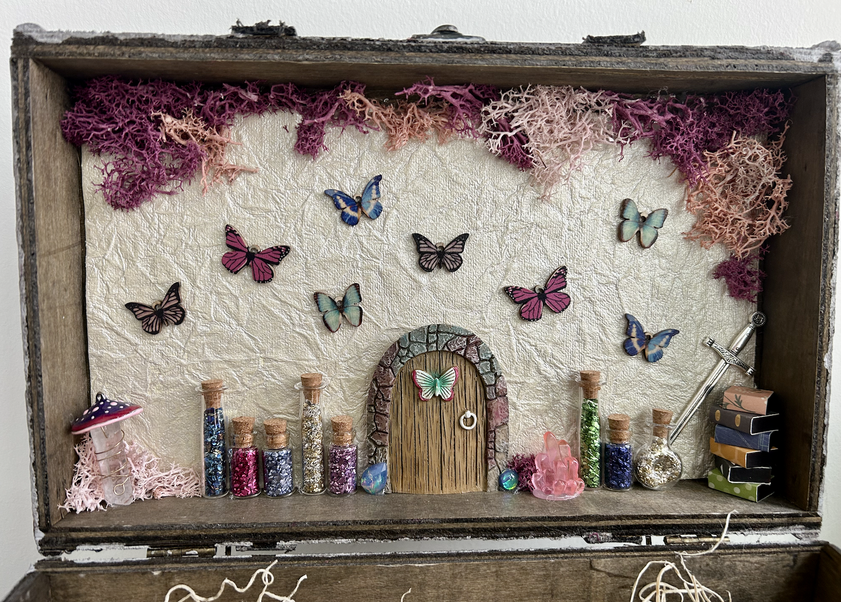 Materials: Wood & faux leather (box), preserved moss, resin mushroom, metal sword charm, mini wooden door, glass potion bottles (with faux magical contents), crystal cluster, butterfly embellishments, natural fiber filler
