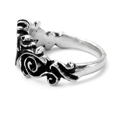 Intricate floriate scrollwork frames the crimson heart, lending the piece an air of antique romance and storybook elegance. Handmade in England from fine English pewter, the Crimson Vow Ring is a small but potent token for lovers of gothic beauty, historical charm, and quiet, enduring passion.