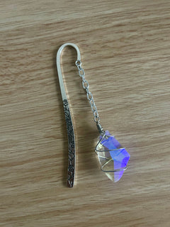 A wire-wrapped iridescent crystal for fantasy readers, mystical stories, and lovers of magical, glowing details.