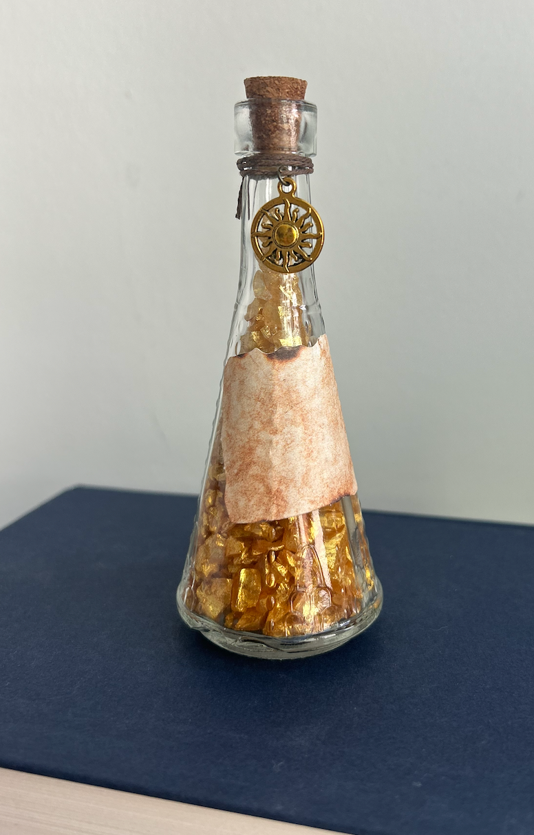 A sunburst in a bottle—Dawnfire Radiance glows with warm golden tones and shimmering light, like the first rays cresting over a distant mountain range. Filled with glistening gold crushed glass and sealed with a vintage sun charm, this tall, slender bottle holds the promise of renewal, hope, and unshakable courage.