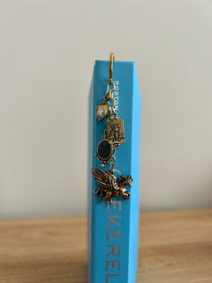 This golden floral-etched bookmark hook carries a trio of celestial and mythic charms: a shimmering iridescent gem that glows like starlight, a tiny book-shaped charm adorned with ancient detailing, a cameo-style oval charm with a winged horse silhouette, and the centerpiece—a proud Pegasus mid-flight, wings spread wide. Each piece feels like a relic from forgotten legends and stories whispered among the constellations.