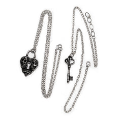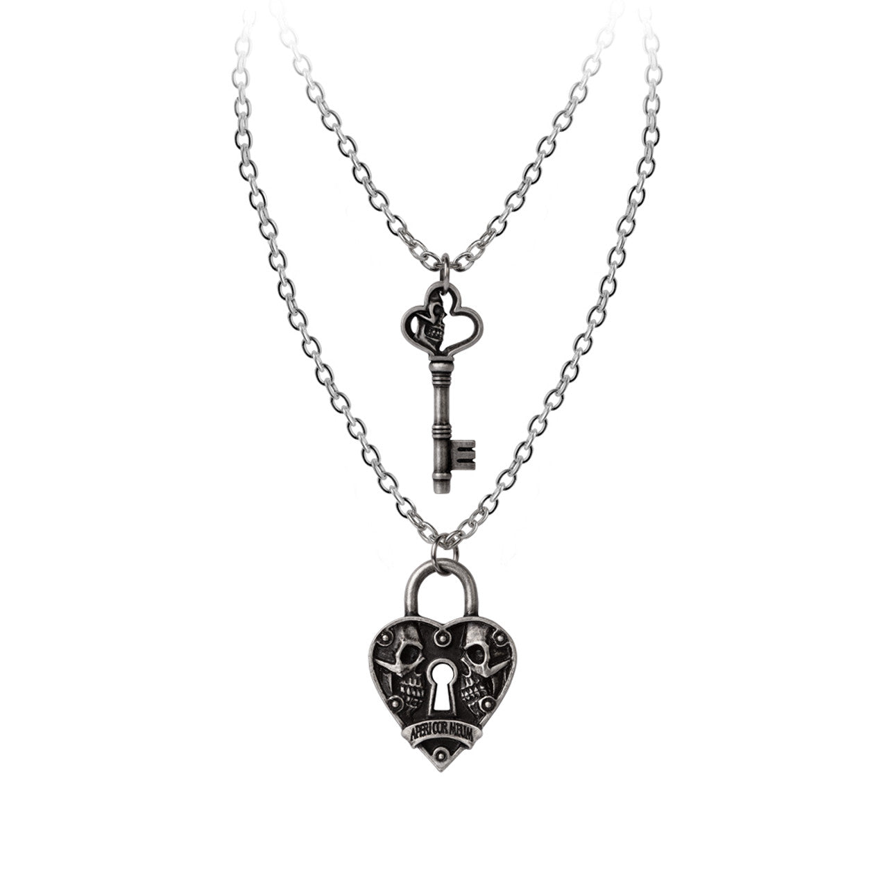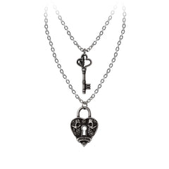 Fated & Forged is a gothic soulmate necklace for lovers bound by something deeper than time. Featuring a heart-shaped padlock etched with twin skulls and a matching key that fits it perfectly, this piece is more than jewelry — it’s a promise. A talisman of eternal devotion, forged in shadow and sealed by fate.