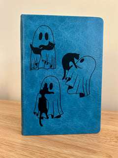 Playful, spooky, and irresistibly charming—this premium A5 journal features an adorable lineup of mischievous ghost cats, blending cozy Halloween vibes with everyday functionality. Set against a rich blue faux leather cover, the design captures that perfect mix of eerie and cute, making it a must-have for cat lovers, spooky-season fans, and creative souls alike.