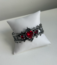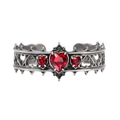 Crafted in fine English pewter, the bracelet features an ornate pierced heart motif and is set with three dazzling ruby-red Austrian crystals. Like a jeweled vow worn in plain sight, it shimmers with regal allure and restrained desire.