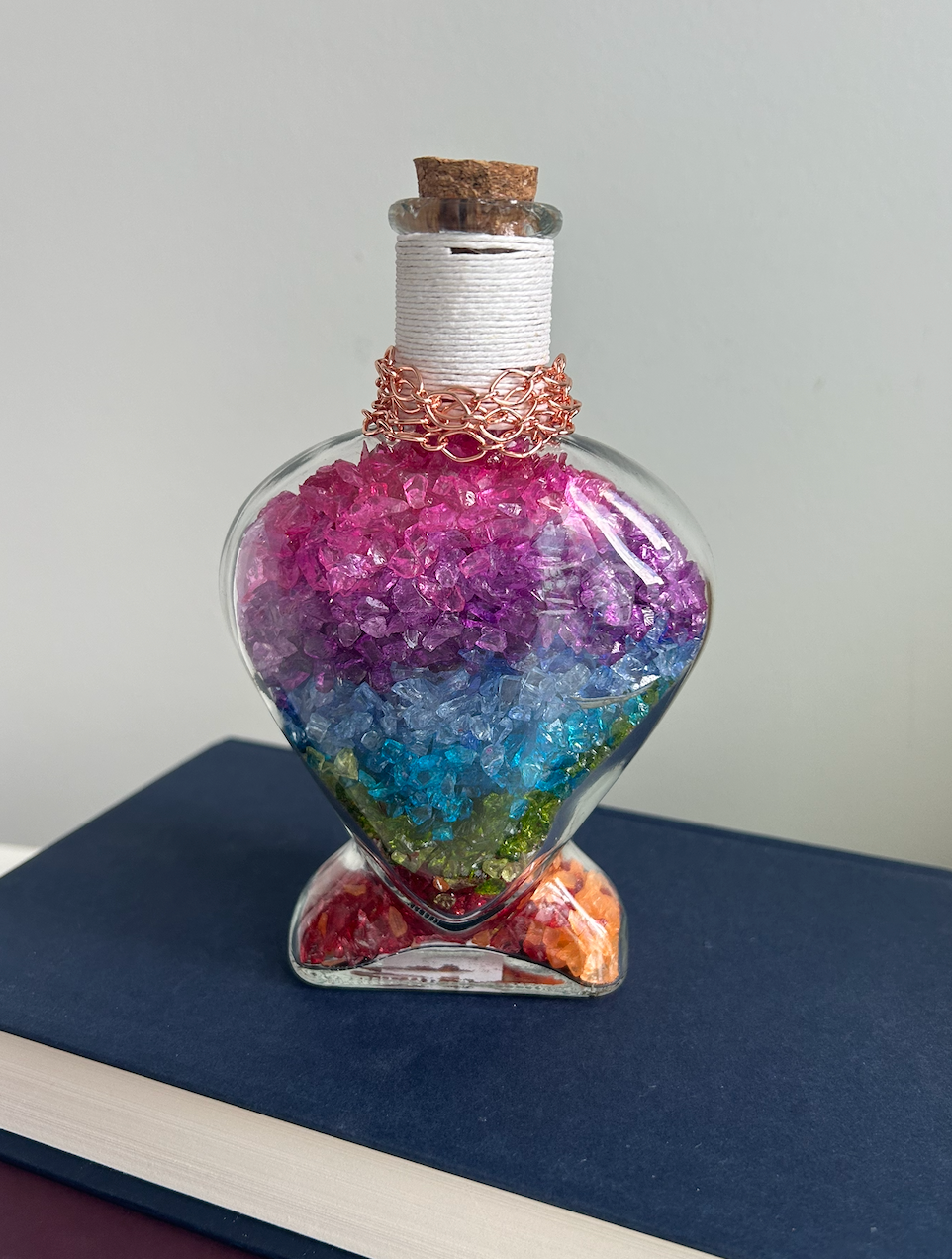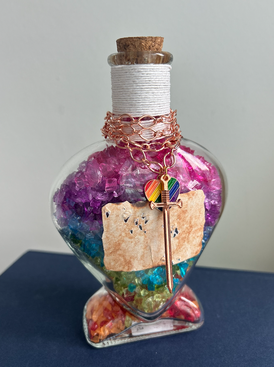 A radiant potion of love, courage, and queer magic. This heart-shaped bottle holds vibrant rainbow crushed glass layered like a spectrum of identity and strength. A rose gold sword-and-heart charm in the colors of the LGBTQ+ pride flag rests against a parchment-style label, wrapped with soft white thread and chain.