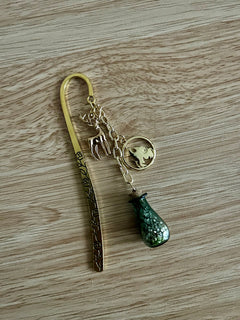 A Throne of Glass–inspired bookmark crafted for fans of magic, forests, and burning destiny. Featuring a golden stag, a fire emblem, and a shimmering green potion bottle, this charm captures the spirit of wilderness, power, and rebirth. Finished on an antique-gold floral hook for an elegant, fae-touched feel.