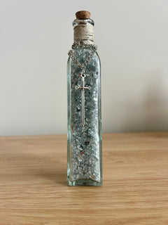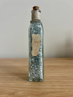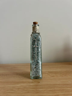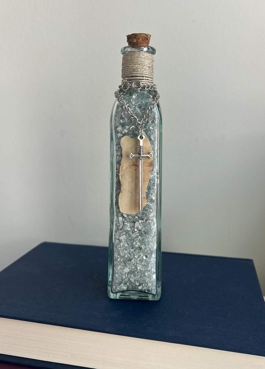 🧵 Details: Glass bottle filled with metallic crushed glass | Neutral twine wrap | Silver sword charm | Aged label for vintage appeal