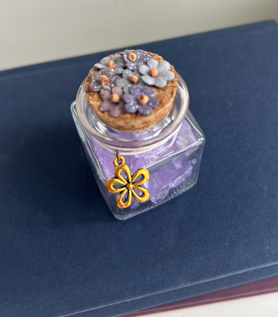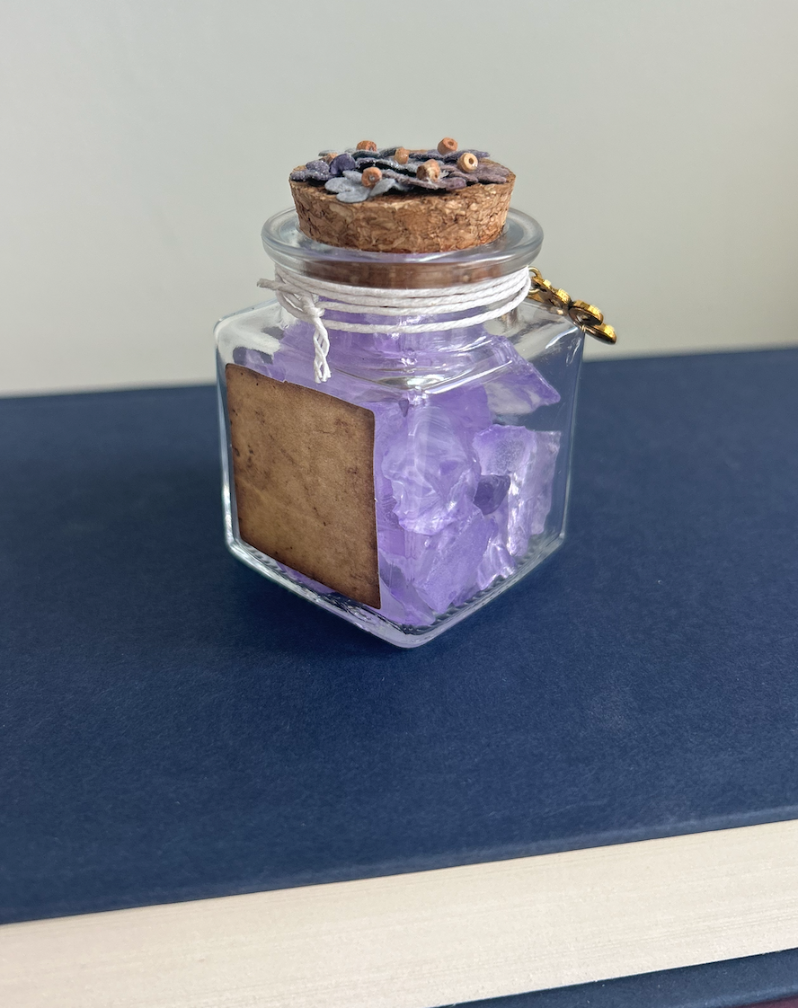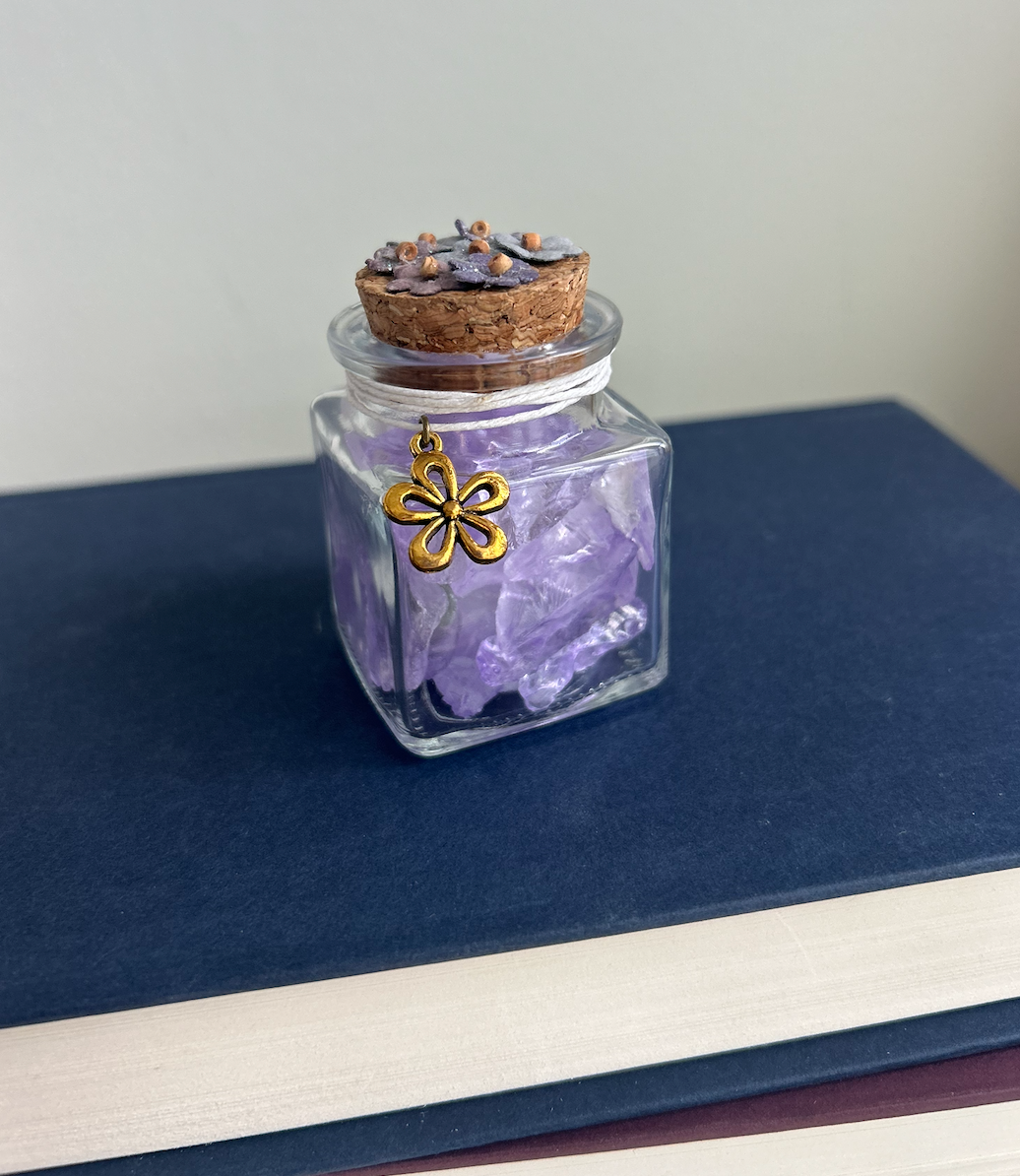 A gentle bloom of magic in a bottle. This square glass jar is filled with soft lavender crushed glass and sealed with a cork adorned in pastel floral detail. A golden flower charm adds a whimsical touch—perfect for fae-touched readers, springtime altars, or garden witch shelves.