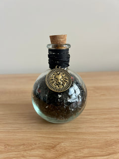 Commanding, bold, and forged in ancient power, Lionheart Valor embodies the courage of a true warrior king. Filled with shimmering obsidian and ember-flecked crushed glass, this round potion bottle radiates the fierce, steady strength of a lion guarding its realm.
