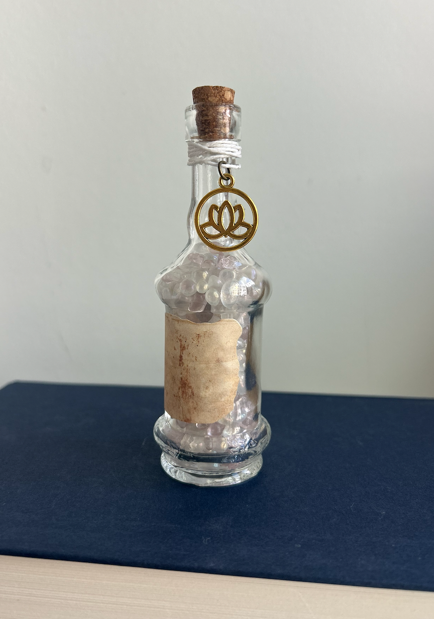 Peaceful and luminous, Lotus Reverie channels serenity and intention. Filled with a soft iridescent blend of glass beads, it's topped with a golden lotus charm and tied with white cotton thread—simple, sacred, and grounding. Like a quiet breath on a page, this elixir invites calm and clarity.