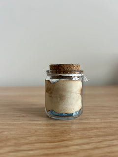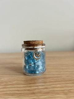 A starlit tonic for dreamers and romantics. This petite potion bottle glows with icy blue crushed glass and is wrapped in weathered parchment, finished with a silver crescent moon and heart charm. It radiates soft, lunar magic and love-struck energy—ideal for spell shelves, romantasy nooks, or moon-phase rituals.