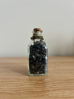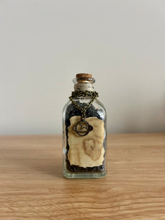 🪄 Details: Blank parchment label | Bronze planet & star charm | Glass bottle filled with shimmering crushed glass.