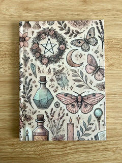 Dreamy, pastel, and enchantingly witchy, Moon Moth Magic is a gentle A5 collage junk journal designed for soft witches, moon lovers, and creatives who adore celestial symbols and botanical magic. This journal is adorned with moths, moon phases, pentacles, potion bottles, crystals, candles, herbs, and tiny stars — all illustrated in soft, delicate tones.