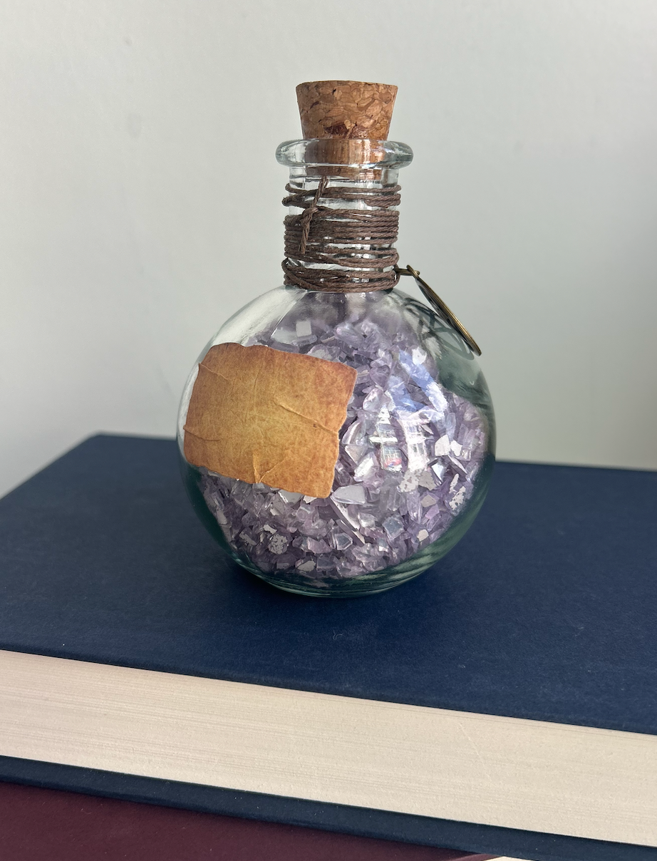 ๐งต Details: Glass bottle with lilac & pearl-toned crushed glass (not real crystals) | Rustic brown wrap | Bronze pentacle charm