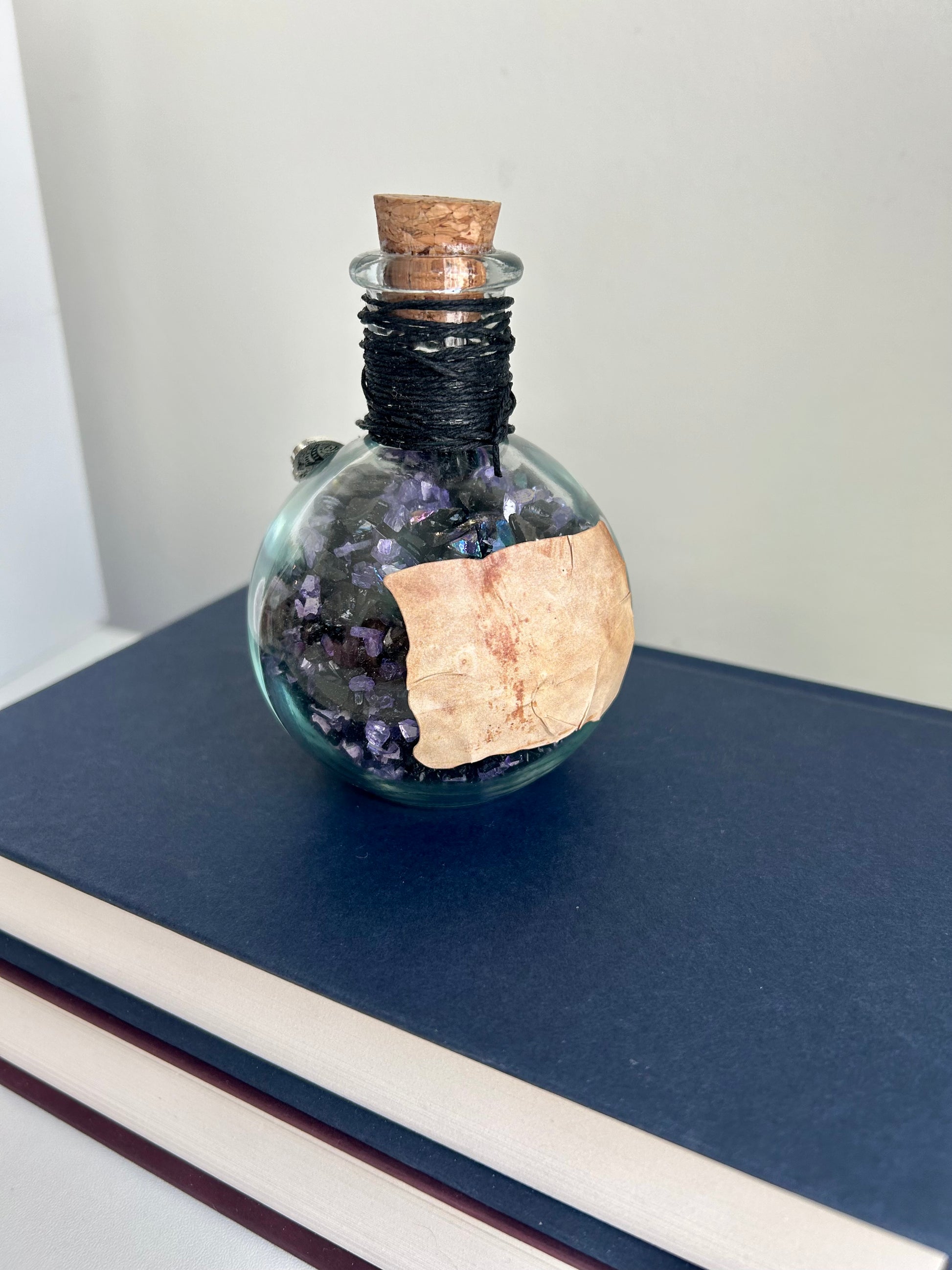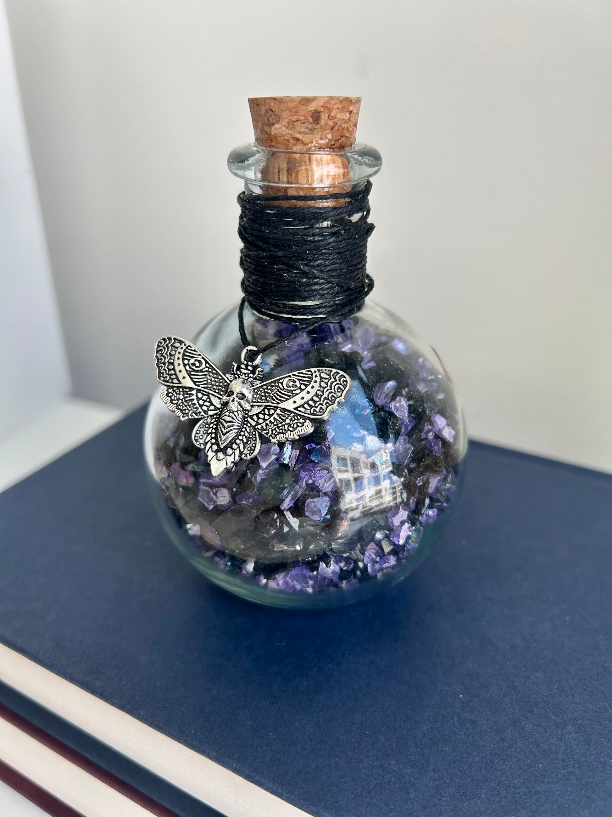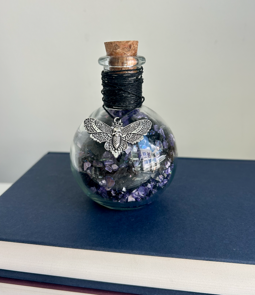 Dark as a moonless sky, Moth of Midnight is a potion steeped in mystery. A rounded glass vessel holds five ounces of violet-black crystal glass, wrapped in black cord and sealed with a silver moth charm. Symbol of shadow and transformation, the midnight moth whispers of hidden paths and quiet power.