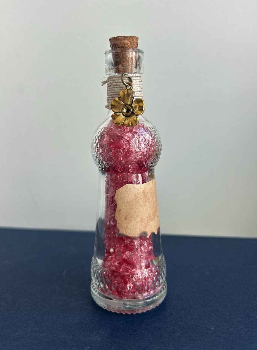 ✨ Details: Pink crushed glass (not real crystals) | Brass floral charm | Linen wrap | Aged paper label