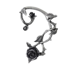 This polished pewter ear cuff spirals gracefully around the ear, crowned with a black resin rose at its base. Designed for the left ear, it features a surgical steel post for comfortable wear.