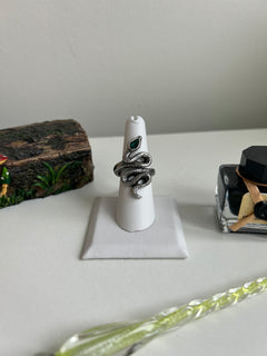 The Serpent’s Ambition Ring winds elegantly around the finger in textured English pewter, crowned with a piercing emerald-green Austrian crystal at its head. This striking ring evokes the cunning of ancient gods and the transformative magic of the underworld — a statement piece for witches, romantasy heroines, and those who embrace duality.