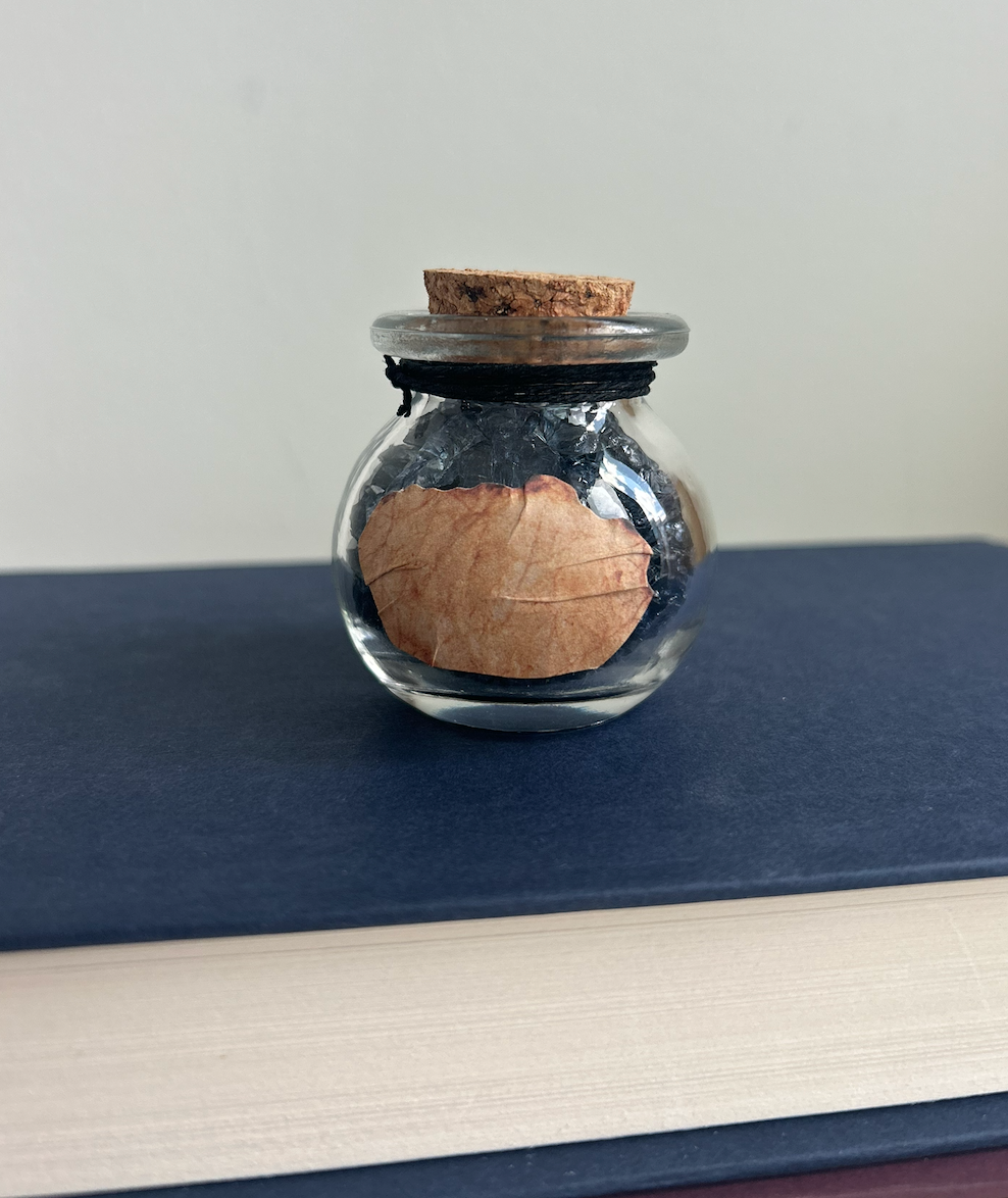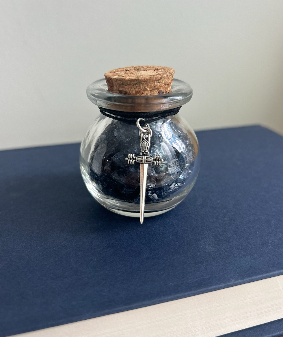Distilled from moonless battles and midnight oaths. This round glass vial holds deep obsidian-hued crushed glass and is adorned with a silver sword charm—evoking the courage of champions, dark princes, and cursed quests. A dramatic piece for fantasy lovers, readers of epic romance, or DnD adventurers.