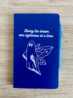 Whimsical, spooky, and a little too relatable—this deep blue journal is perfect for anyone navigating life with equal parts humor and chaos. Featuring a celestial ghost with delicate fairy wings and the phrase “Living the dream, one nightmare at a time.”, it’s the ideal blend of cute, gothic, and unhinged energy.