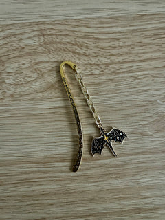 A romantasy-inspired dragon charm bookmark designed for readers who love powerful riders and their loyal winged companions. The black-and-gold dragon, marked with tiny star details, evokes epic bonds, midnight flights, and all the tension-filled moments only fantasy romance delivers. Finished with an antique-gold hook for a magical, heirloom feel.
