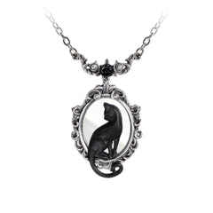 • Ornate pewter pendant featuring a black cat and mirror centerpiece