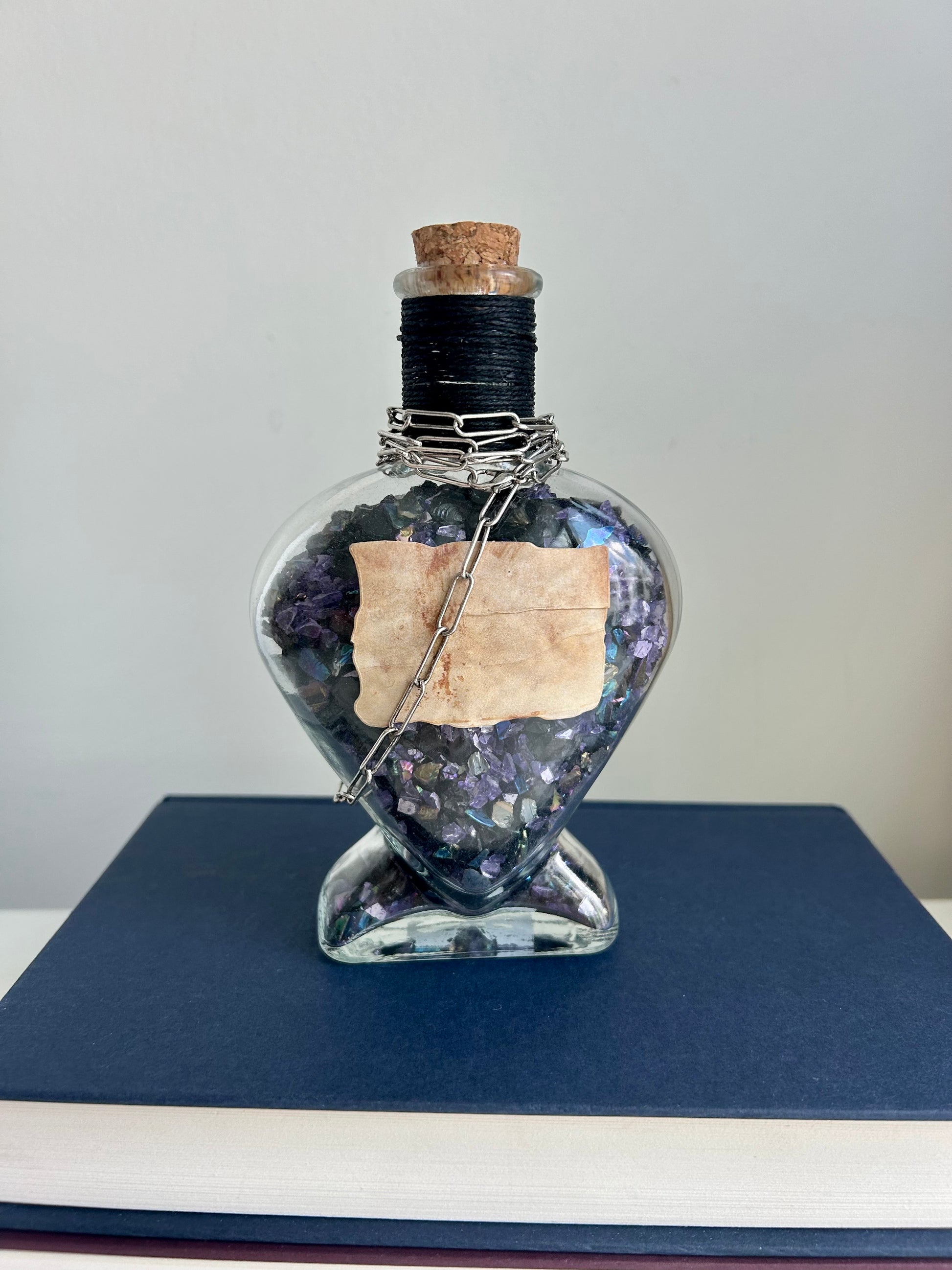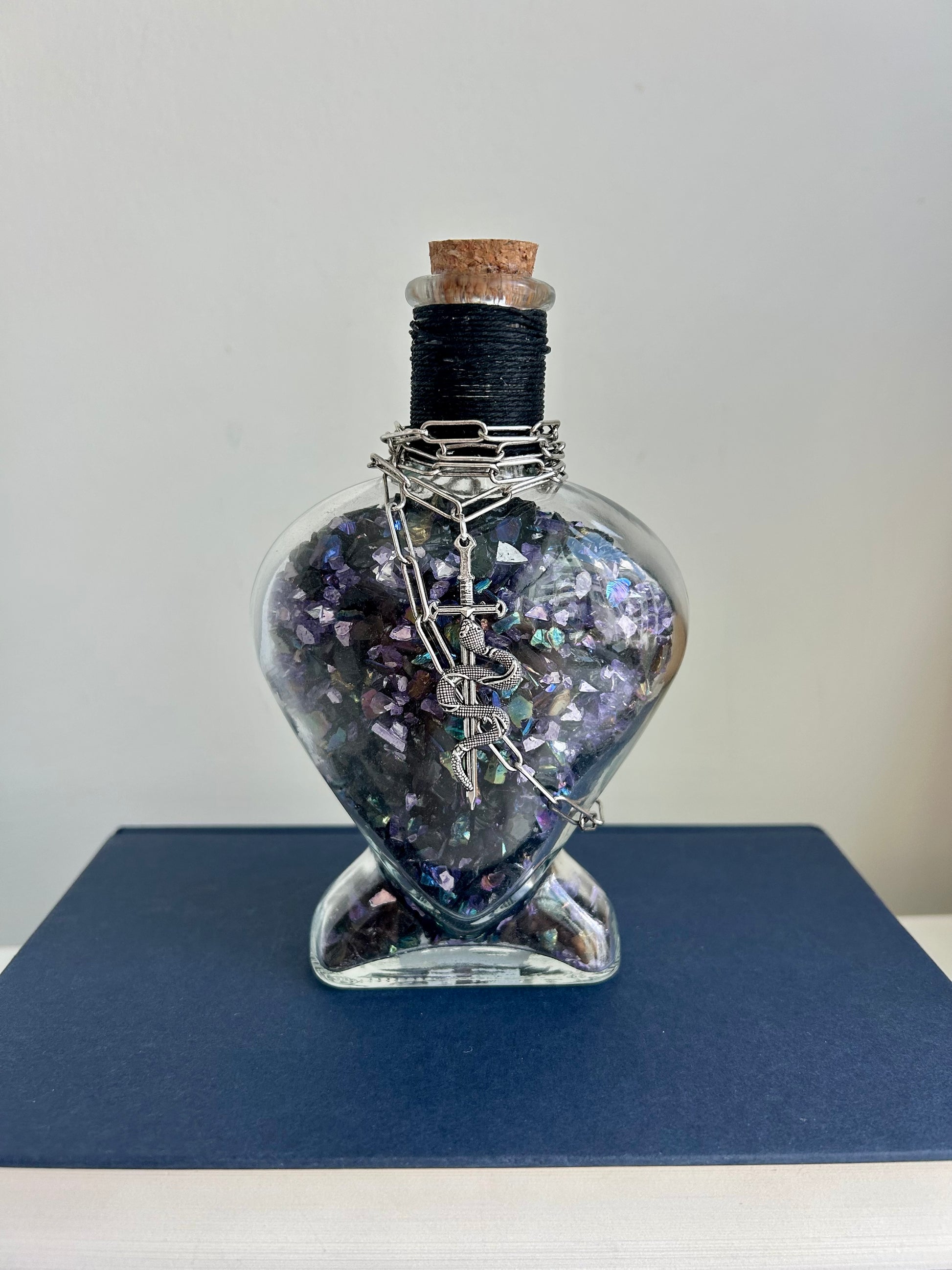 ⢠Sealed with cork, wrapped in black cord and silver chain with serpent-and-sword charm